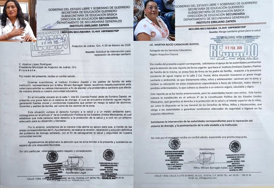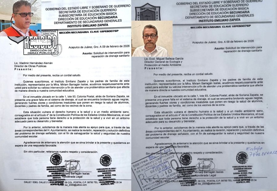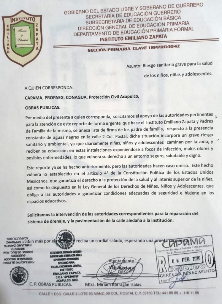 Acapulco, Guerrero, 12 de Febrero de 2026.— Padres de familia del Instituto Emiliano Zapata, ubicado en la colonia Postal de este puerto, documentaron formalmente solicitudes de intervención ante distintas autoridades municipales y estatales por un colapso del sistema de drenaje que, representa un riesgo sanitario para niñas, niños y adolescentes por aguas negras 🏫⚠️.