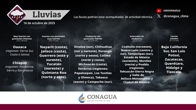 Ciudad de México, 16 de octubre de 2025 — El Servicio Meteorológico Nacional (SMN) emitió una alerta nacional por un frente de lluvias intensas, heladas en zonas montañosas del norte y oleaje elevado en costas del Pacífico, derivado de múltiples fenómenos atmosféricos que convergen sobre el territorio mexicano.