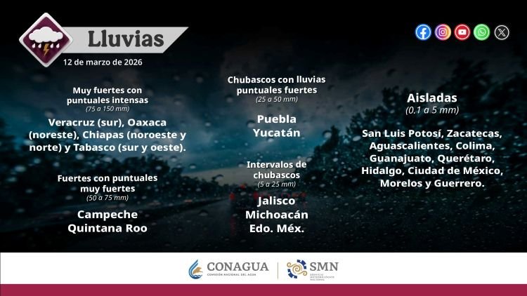 También se esperan lluvias fuertes a muy fuertes en Campeche y Quintana Roo, mientras que chubascos con lluvias fuertes podrían presentarse en Puebla y Yucatán.