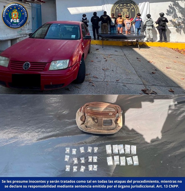 19 de julio de 2025.-La Fiscalía General del Estado de Guerrero (FGEGuerrero), en coordinación con la Secretaría de la Defensa Nacional (Sedena), la Guardia Nacional (GN), la Secretaría de Seguridad y Protección Ciudadana (SSPC) y la Secretaría de Seguridad Pública de Guerrero (SSPGro), informó este viernes (19.07.2025) la detención en flagrancia de cuatro personas relacionadas con actividades de narcomenudeo en el municipio de Acapulco.