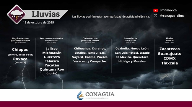 Ciudad de México, 15 de octubre de 2025. – 🌧️ El Servicio Meteorológico Nacional (SMN) y la Comisión Nacional del Agua (Conagua) informaron que este miércoles continuarán las lluvias intensas y muy fuertes en gran parte del país.