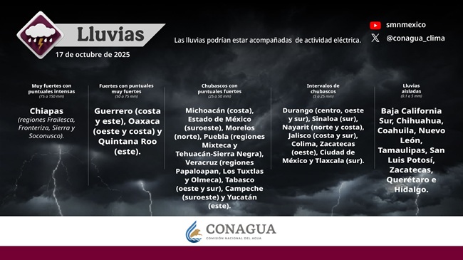 Ciudad de México | 17 de octubre de 2025 — El Servicio Meteorológico Nacional (SMN) informó que este viernes se esperan lluvias intensas en Chiapas y muy fuertes en Guerrero, Oaxaca y Quintana Roo.