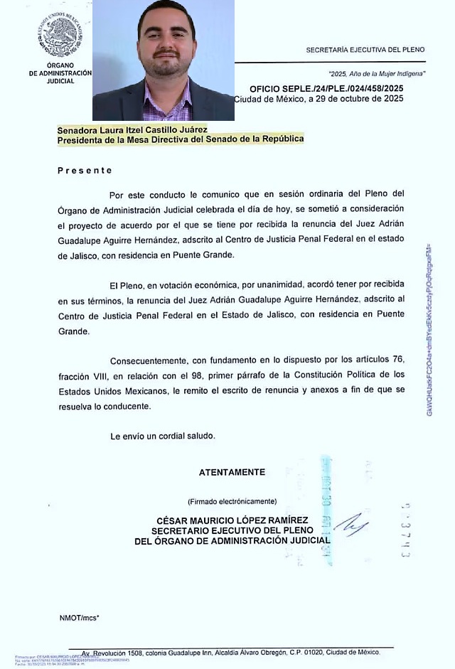 Ciudad de México | 4 de noviembre de 2025.-El primer juez federal electo en Jalisco bajo el nuevo sistema democrático del Poder Judicial renunció a su cargo tras solo dos meses de haber asumido. Se trata de Adrián Guadalupe Aguirre Hernández, adscrito al Centro de Justicia Penal Federal en la entidad.