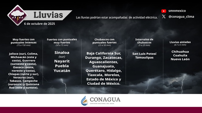 Además, habrá lluvias muy fuertes en Sinaloa, Nayarit, Puebla y Yucatán, y chubascos en la CDMX, Estado de México, Morelos y otras entidades del centro del país.