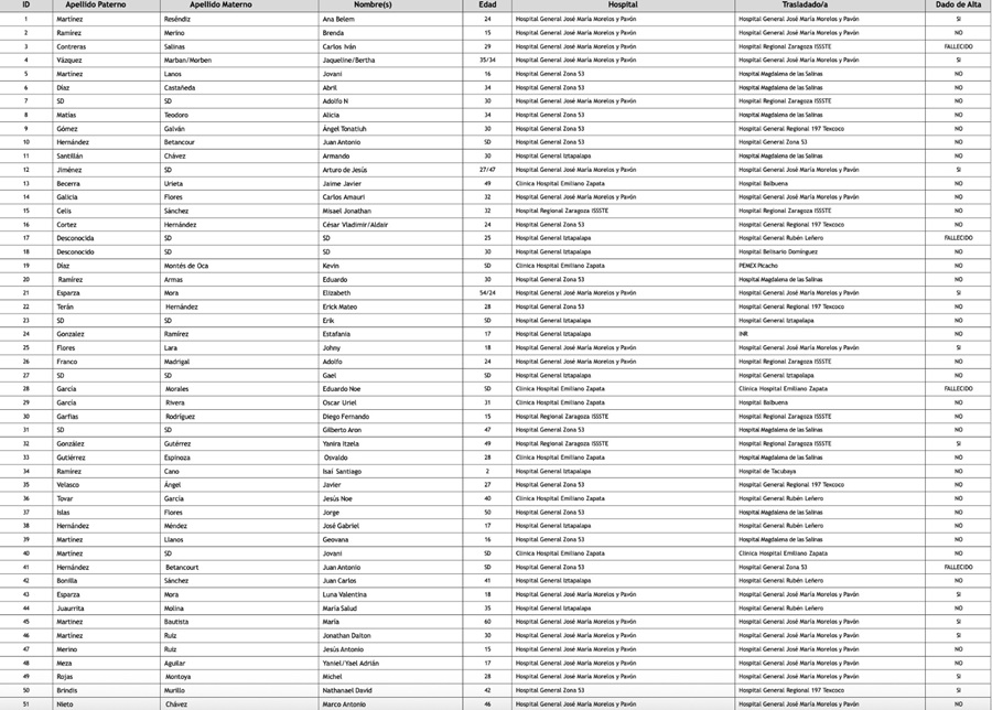 Las víctimas fueron trasladadas a hospitales como el Juan Ramón de la Fuente, ISSSTE Zaragoza, IMSS Los Reyes, INR, Hospital Balbuena y Ampliación Emiliano Zapata, entre otros.