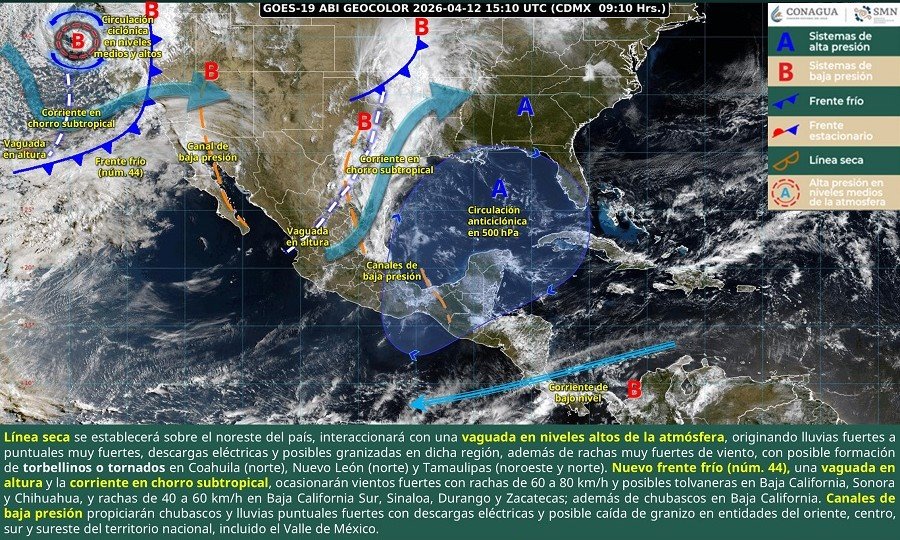 El Servicio Meteorológico Nacional y la Comisión Nacional del Agua exhortan a la población a mantenerse informada y seguir las indicaciones de Protección Civil ante un panorama climático que combina múltiples riesgos.